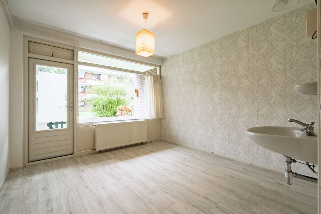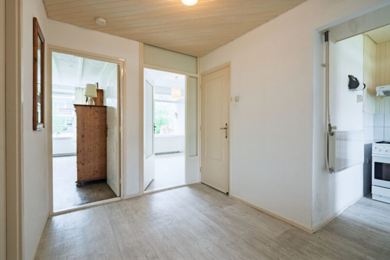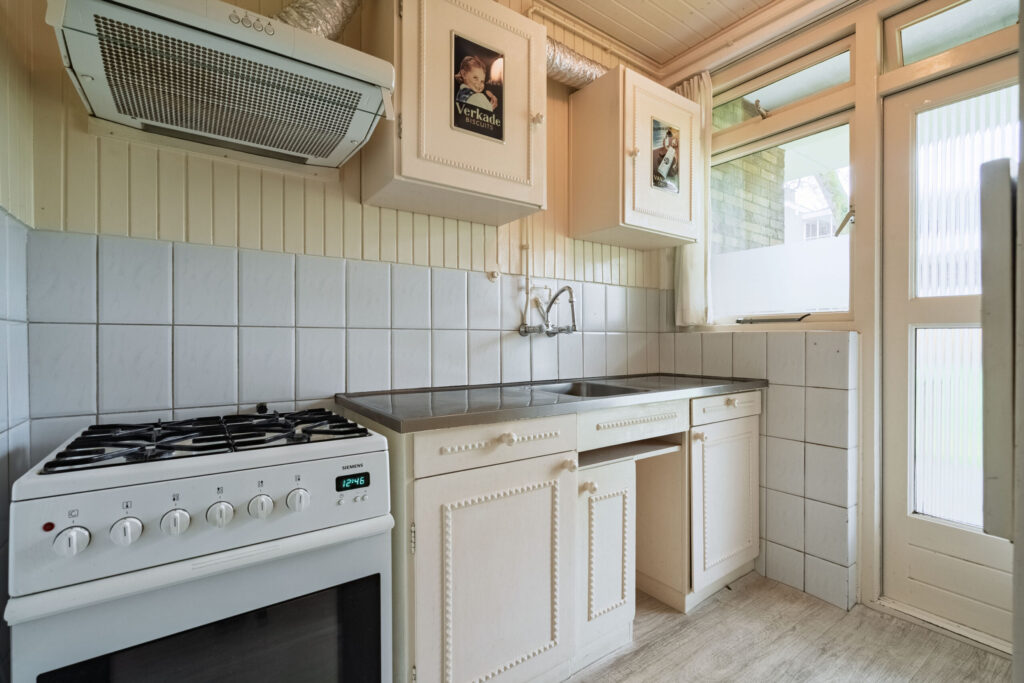 De keuken is gesitueerd aan de voorzijde van het appartement en is voorzien van een gasfornuis en afzuigkap. Tevens biedt de keuken toegang tot de galerij.
