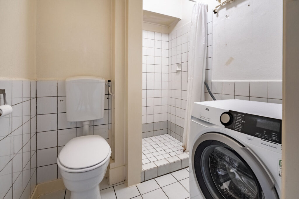 De betegelde badkamer is voorzien van een toilet, douche en aansluitingen voor wasapparatuur.