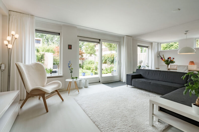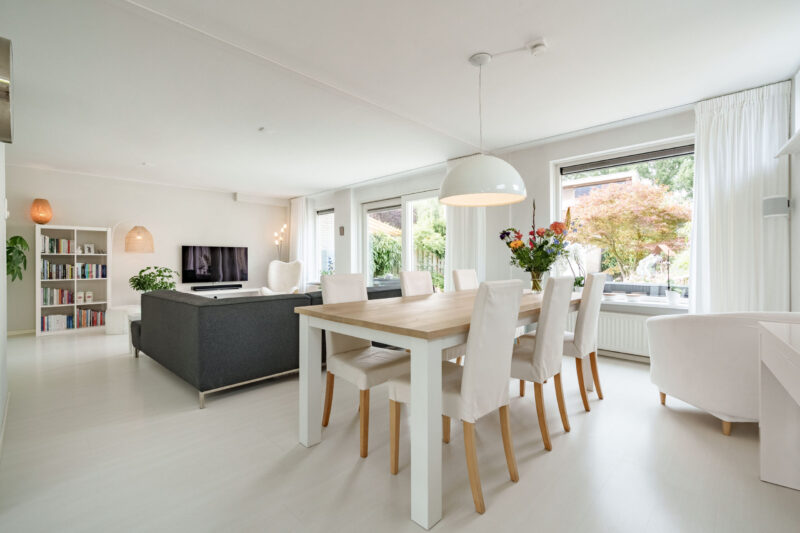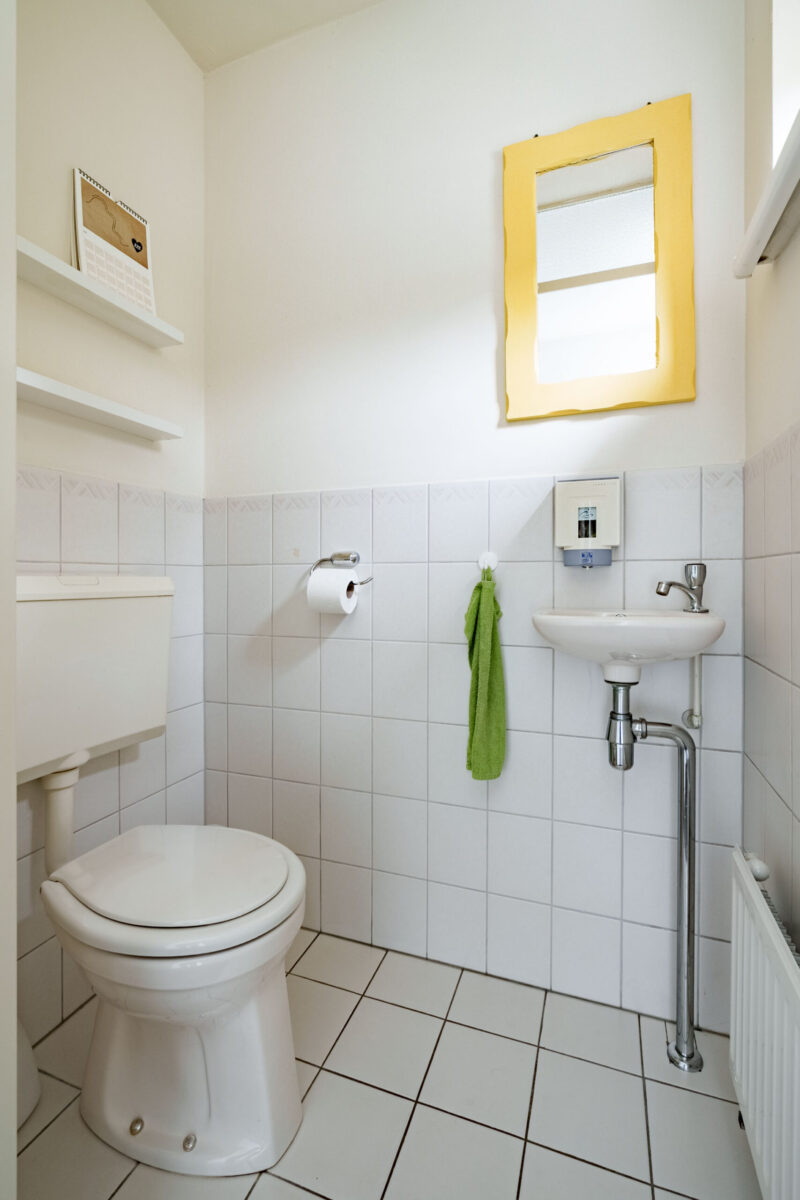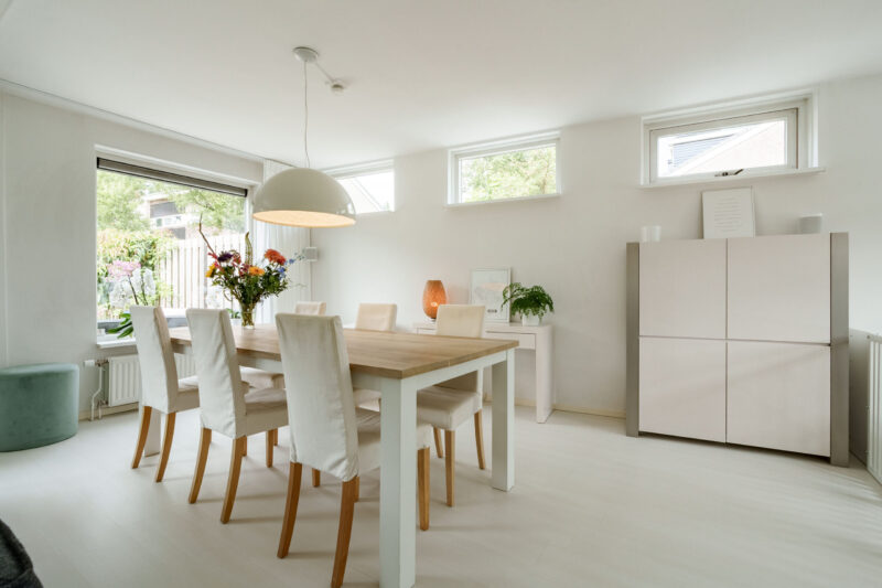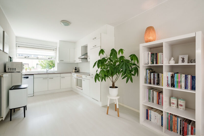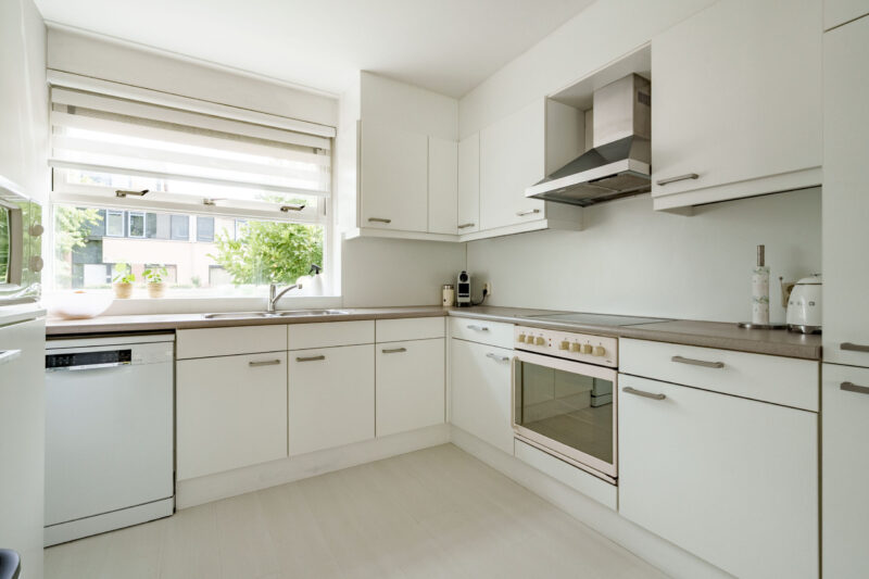 Bij binnenkomst komt u in de hal, die toegang geeft tot de riante woonkamer, de praktische trapopgang met trappenkast voor extra bergruimte, en een toilet met een fonteintje. De woonkamer is dankzij de fijne raampartijen licht te noemen. De woonkamer is voorzien van een lichte laminaatvloer en strakke witte wanden, wat de ruimte een frisse en moderne uitstraling geeft. Vanuit de woonkamer heeft u direct zich op de achtertuin, wat zorgt voor een prettig binnen-buiten gevoel. De L-vormige keuken is voorzien van diverse inbouwapparatuur, waaronder een keramische kookplaat, oven, koel-vriescombinatie en een afwasmachine.