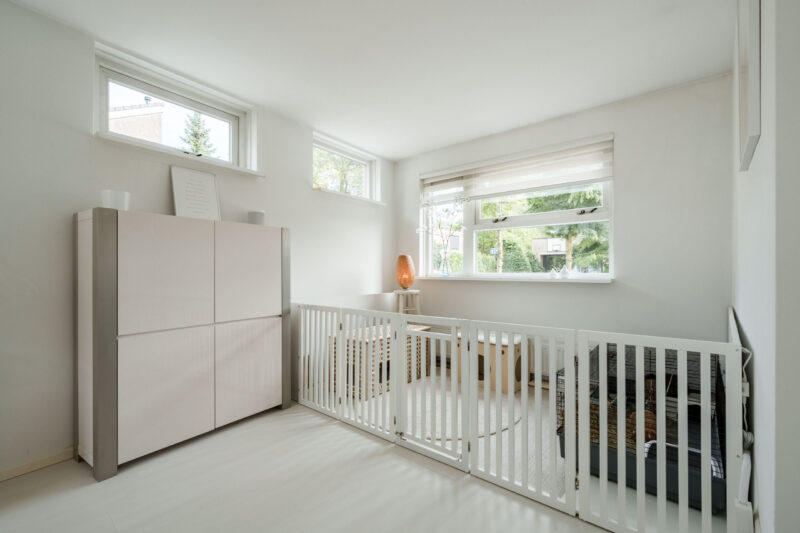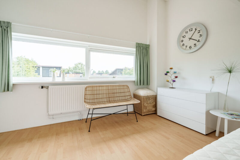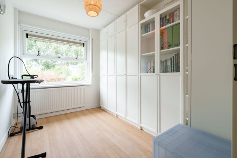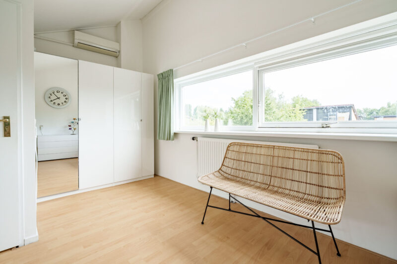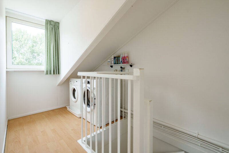 Op de overloop bevinden zich de aansluitingen voor wasapparatuur. De gang geeft toegang tot een vierde, zeer ruime kamer over de gehele breedte van het huis met zowel aan de voor- als de achterzijde grote, brede ramen waardoor het daglicht rijkelijk naar binnen valt. Ook deze slaapkamer is voorzien van een laminaatvloer. De royale afmetingen bieden niet alleen plek voor een tweepersoonsbed en extra kastruimte, maar maken het ook mogelijk de ruimte eenvoudig te verdelen in twee volwaardige kamers. Voor comfort is de kamer uitgerust met een airco, zodat het er ook tijdens warme zomerdagen aangenaam blijft. Achter de knieschotten is bovendien praktische bergruimte aanwezig.