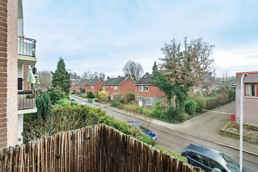 Entree, hal, dichte keuken met een keukenblok en een vaste kast met de CV.-gas HR combiketel en toegang tot een balkon, woonkamer met eetkamer, tweede balkon, totaal drie slaapkamers, badkamer, separate toiletruimte. Diverse vaste kasten.