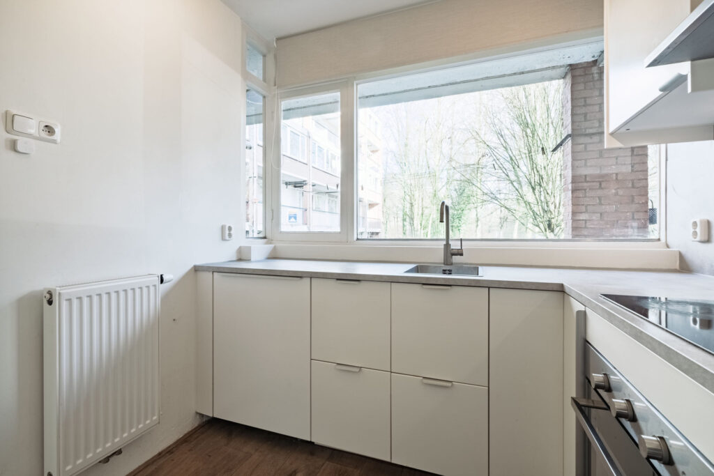 Eerste woonlaag: entree/hal, toilet, gesloten keuken voorzien met hoekopstelling en voorzien van diverse inbouwapparatuur, te weten: 4-pits kookplaat, afzuigkap en koel-/vriescombinatie. In de keuken is ook de aansluiting voor de wasmachine aanwezig. Royale woonkamer met toegang tot het balkon- terras.
