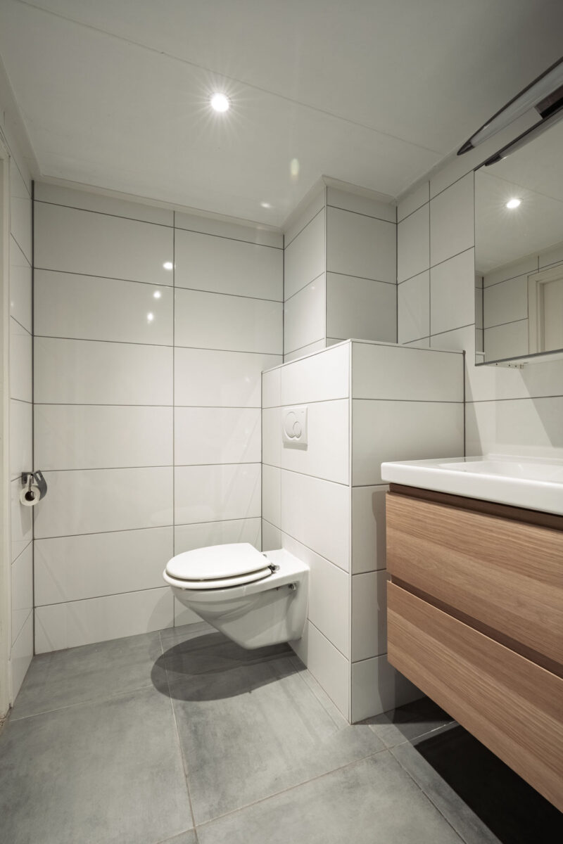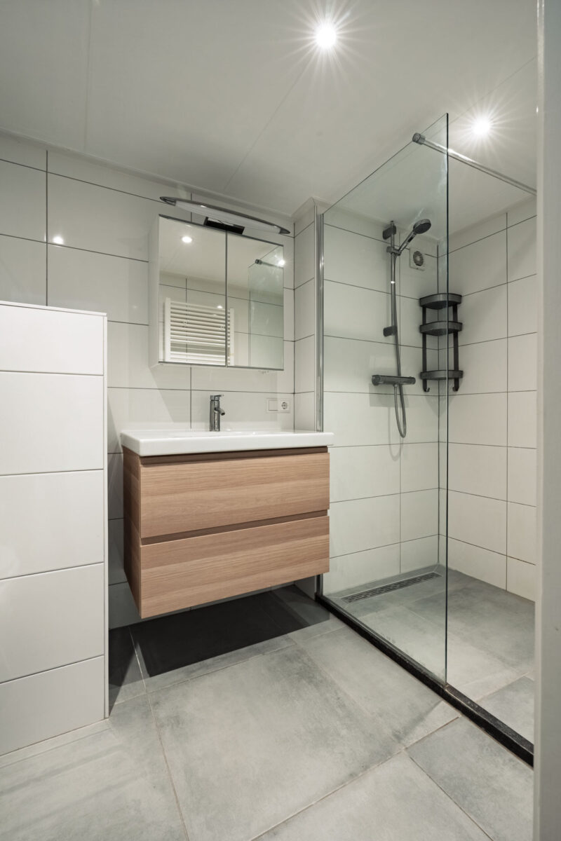 Tweede woonlaag: overloop, drie slaapkamers, waarvan één met een inbouwkast en wastafel, vernieuwde badkamer voorzien van een ruime douche, wastafelmeubel en toilet.