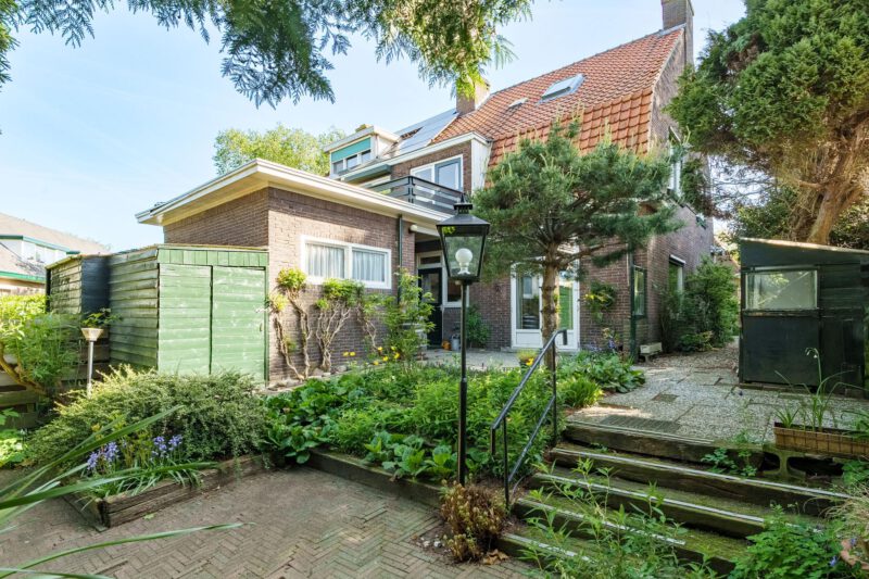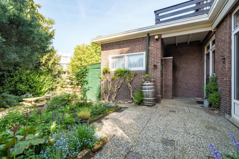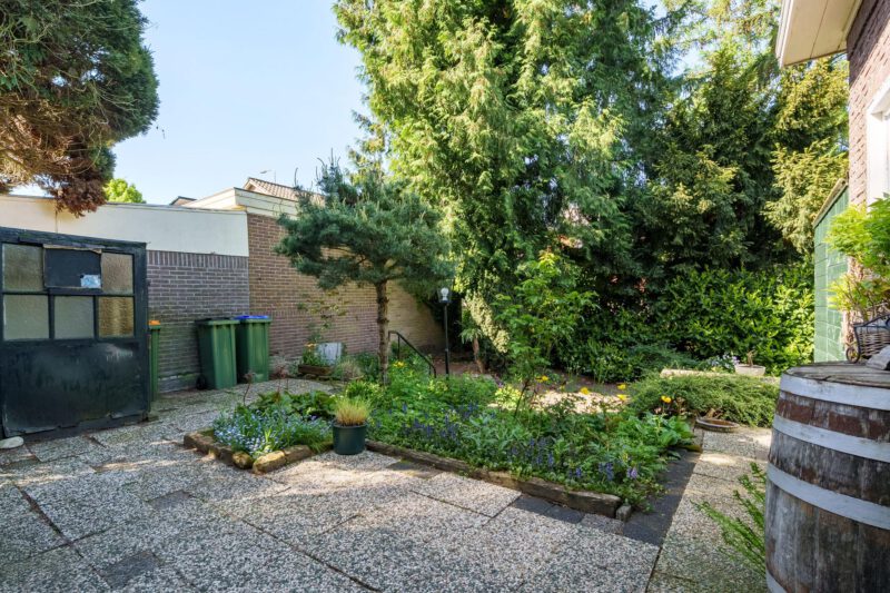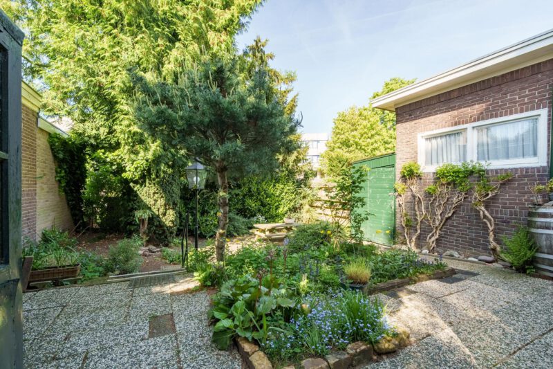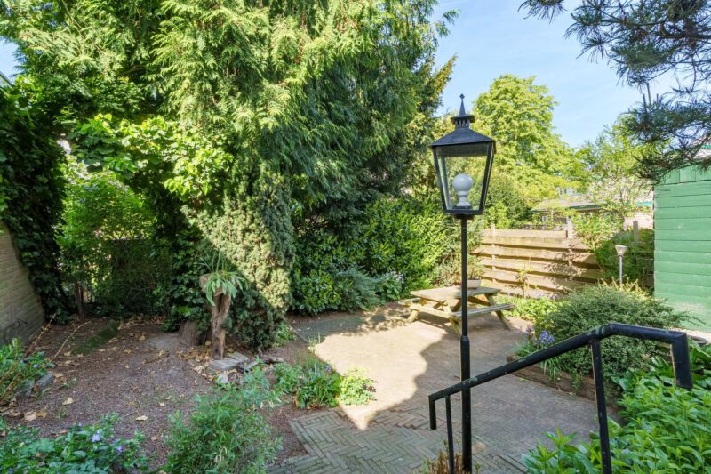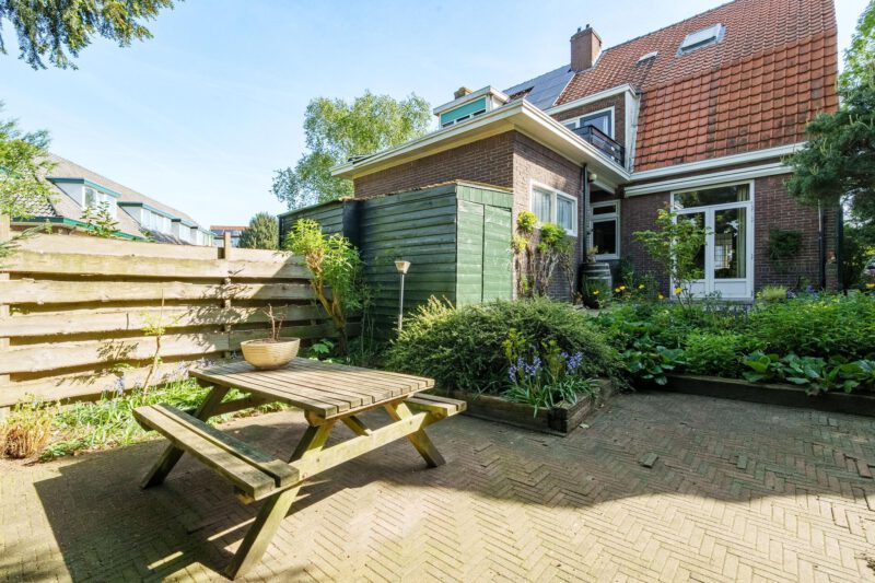 De woning beschikt over een diepe, groene achtertuin met een gunstige ligging op het westen, waardoor men gedurende de middag en avonduren optimaal van de zon kan genieten. Direct grenzend aan de woning bevindt zich een verhoogd terras, dat plek biedt voor het plaatsen van een buitentafel of loungehoek. De tuin biedt volop privacy en rust, en vormt daarmee een verlengstuk van de woonruimte. Tevens is er een stenen schuur aanwezig, met daarachter een aangebouwd houten schuurtje, ideaal geschikt voor het stallen van fietsen, tuingereedschap of als extra opslagruimte.