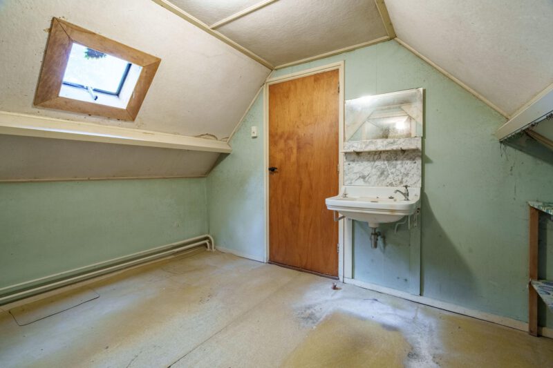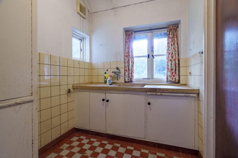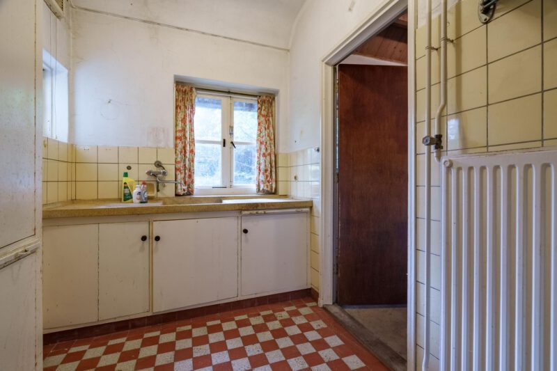 Dichte keuken met de oorspronkelijke keukeninrichting. Aansluitend de ruime berging met de C.V.-gas combiketel en de groepenkast. Er zijn twee deuren aanwezig die toegang bieden tot de tuin.