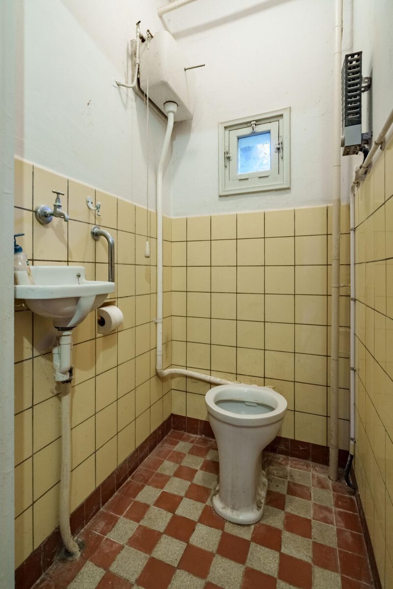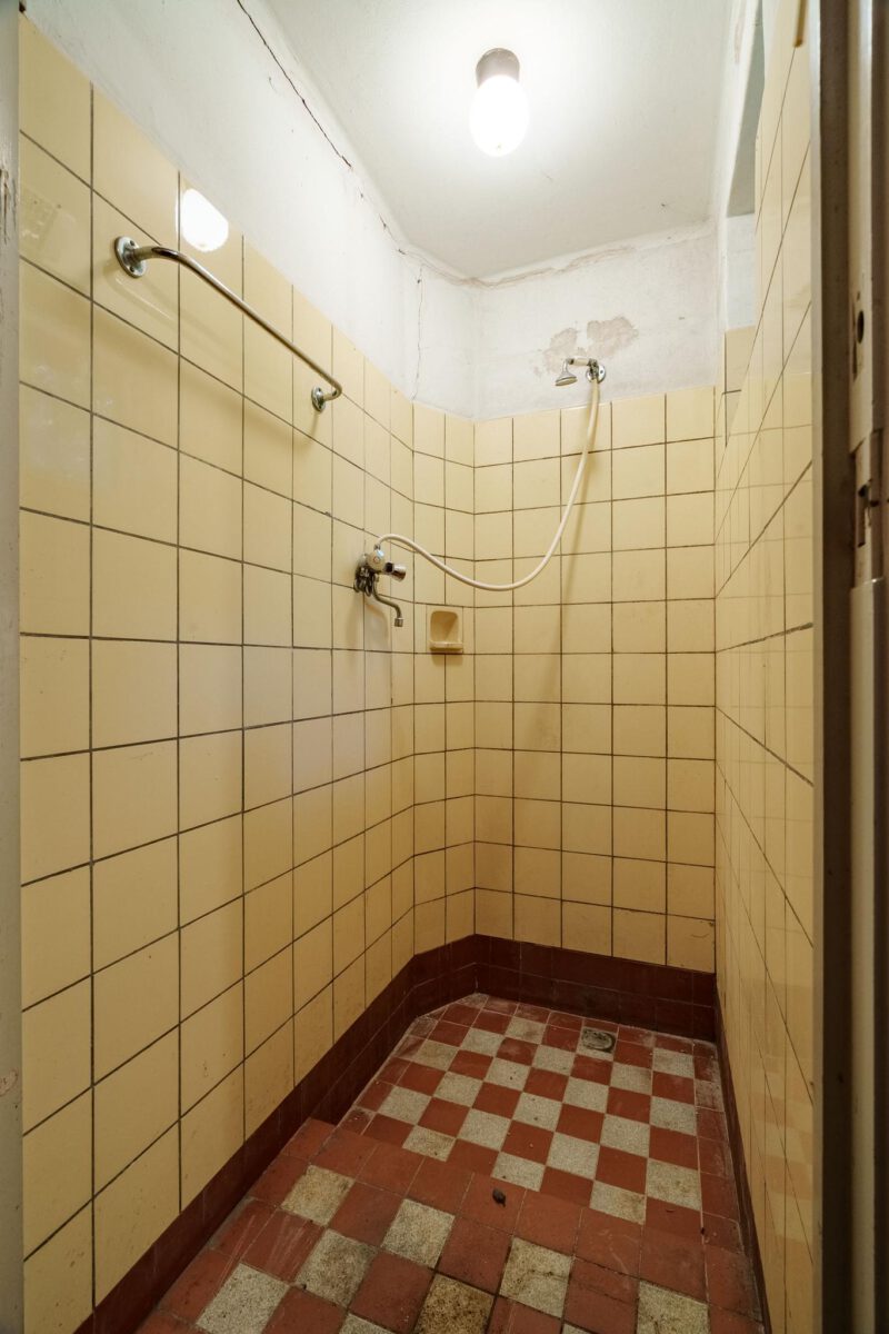 Entree, hal met de authentieke jaren ’50 vloertegels die ook aanwezig zijn in de keuken, toilet en doucheruimte.
