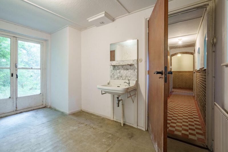 Woonkamer met openslaande tuindeuren en de authentieke doorgeefkast naar de keuken.