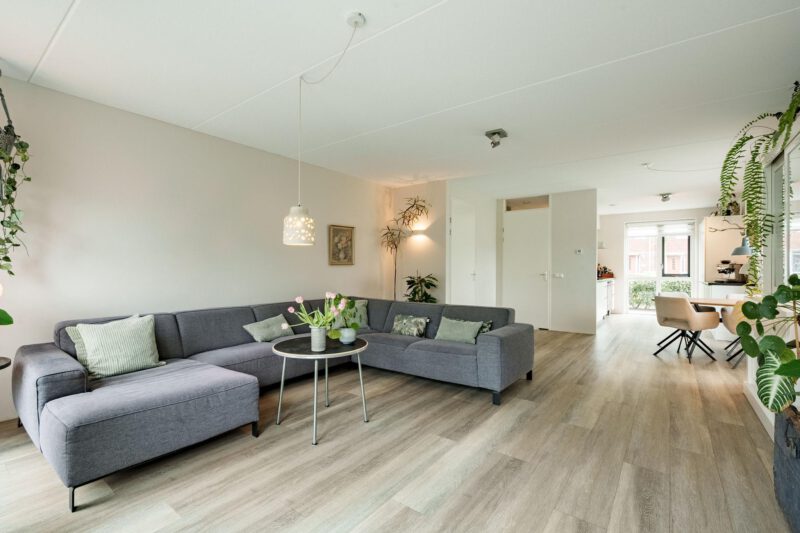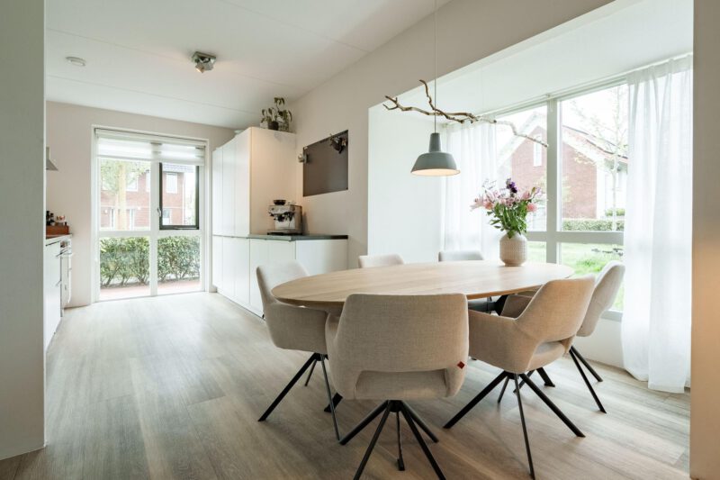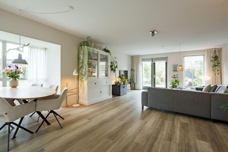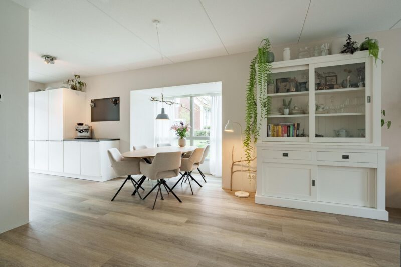 Bij binnenkomst valt direct het licht en de ruimte op. In de hal bevindt zich het moderne toilet met fontein, waarna u de ruime woonkamer met erker binnenstapt. Grote ramen aan de achterzijde en extra zijlicht door de hoekligging zorgen voor een open en luchtige sfeer. Openslaande deuren verbinden de woonkamer met de zonnige en groene tuin, waar het onder de ruime veranda het hele jaar goed toeven is.
