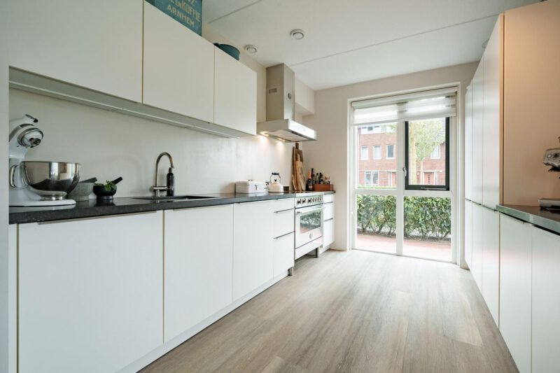 De moderne keuken bevindt zich aan de voorzijde van de woning en is opgesteld aan twee zijden, waardoor u zowel voldoende werkruimte als opbergruimte heeft. Het ontwerp is praktisch en licht, met een prettig uitzicht op de rustige straat en parkzone terwijl u kookt. De keuken is uitgerust met een professioneel Bertazzoni inductiefornuis met oven, afzuigkap, koel-/vriescombinatie en vaatwasser. De gehele woning is voorzien van een mooie PVC-vloer.