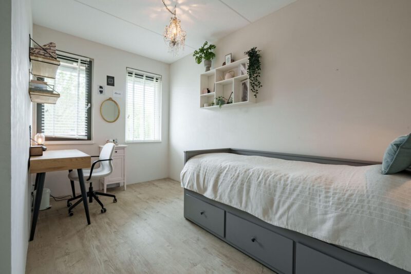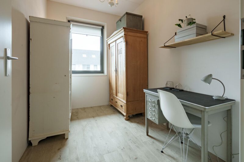 Op de tweede verdieping zijn nog twee slaapkamers gesitueerd. De grootste kamer aan de achterzijde is voorzien van een brede dakkapel, waardoor deze bijzonder licht en ruim aanvoelt. Aan de voorzijde is een kamer met een kleinere dakkapel en zijraam, die uitstekend dienst kan doen als slaapkamer, hobbyruimte of kantoor. Op deze verdieping is ook een aparte, afgesloten ruimte aanwezig met aansluiting voor wasmachine en droger. Ook deze ruimte is voorzien van daglicht dankzij de dakkapel. Achter de knieschotten in beide slaapkamers is extra opbergruimte beschikbaar.