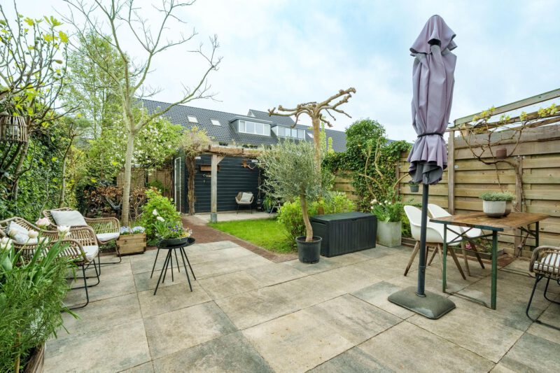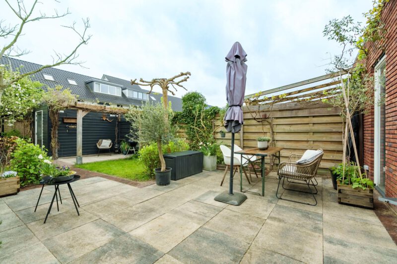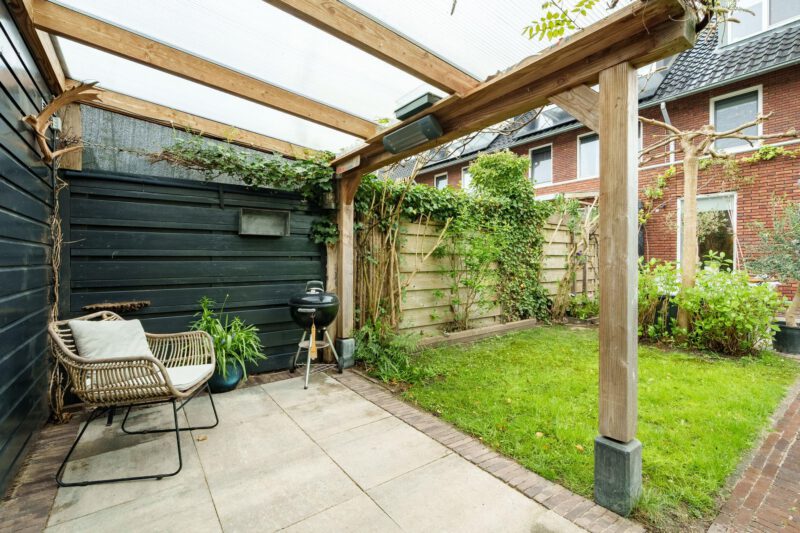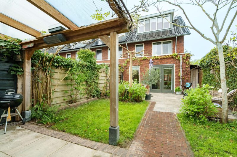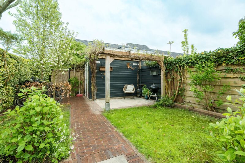 De zonnige en diepe achtertuin op het zuiden is fraai aangelegd met een rijke variatie aan beplanting, waaronder een appelboom, moerbei en Perzische slaapboom. Achter in de tuin bevindt zich een ruime veranda: een fijne plek om te ontspannen. Dankzij de hoekligging en begroeiing met onder andere druif en blauwe regen geniet u hier van veel privacy en verkoeling in warme zomers. De tuin beschikt verder over een vrijstaande houten berging en een achterom. Door de afwisseling in beplanting is er elk seizoen kleur en sfeer in de tuin.