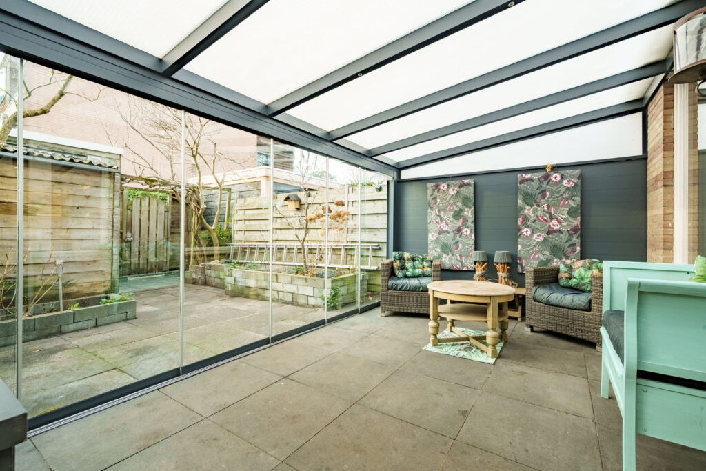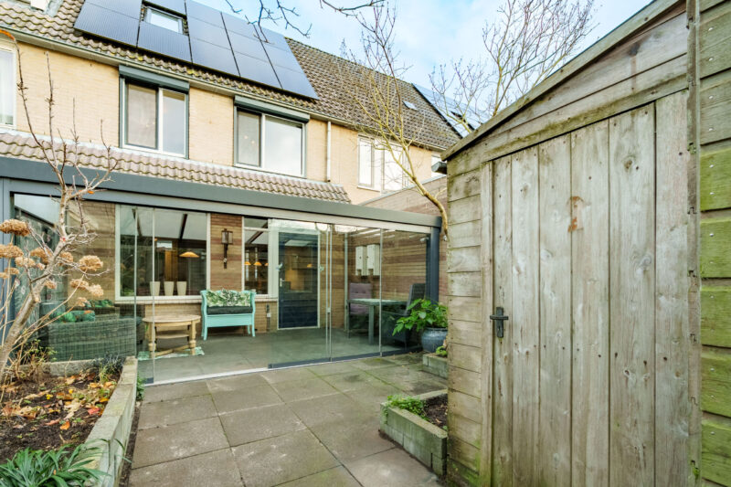 Aan een rustige straat met enkel bestemmingsverkeer ligt deze goed onderhouden UITGEBOUWDE MIDDENWONING met aangebouwde glazen veranda, vrijstaande houten berging en verzorgde aangelegde achtertuin op het zuidwesten die voorzien is van een achterom.