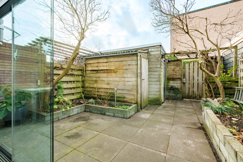De betegelde tuin is gunstig gelegen op het zuidwesten. De vrijstaande houten berging biedt ruimte voor het stallen van fietsen en het opslaan van diverse spullen. Daarnaast is er een praktische achterom aanwezig.